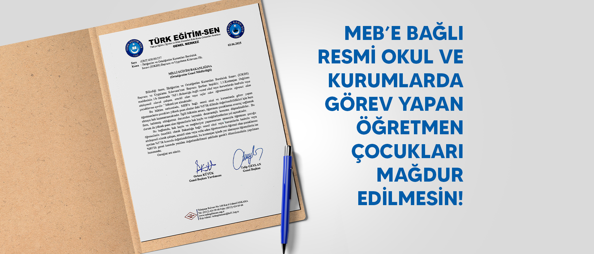 Bu bağlamda, Türk Eğitim Sen olarak  hak kaybı ve mağduriyet yaşanmaması amacıyla öğretmen çocuğu öğrencilerin öncelikli olarak Bakanlığa bağlı resmî okul veya kurumlarda kadrolu veya sözleşmeli olarak çalışan, emekli olan veya vefat eden öğretmenlerin öğrenci olan çocuklarına ayrılan %5’lik kısımda değerlendirilmesini, bu kontenjan içinde yer alamayan öğrencilerin ise %80’lik genel kısımda yeniden değerlendirilmesi şeklinde gerekli düzenlemelerin yapılması hususunda;  MEB’e yazılı başvuruda bulunduk.